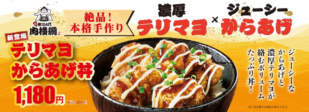 焼きたて本格手作りの肉丼専門店、第104 代肉横綱の秋の新商品は『テリマヨからあげ丼』。 大ぶりのからあげに甘じょっぱいテリヤキソースとこってりマヨネーズがよく合います! ご飯がすすむがっつり丼、ぜひお試しください。